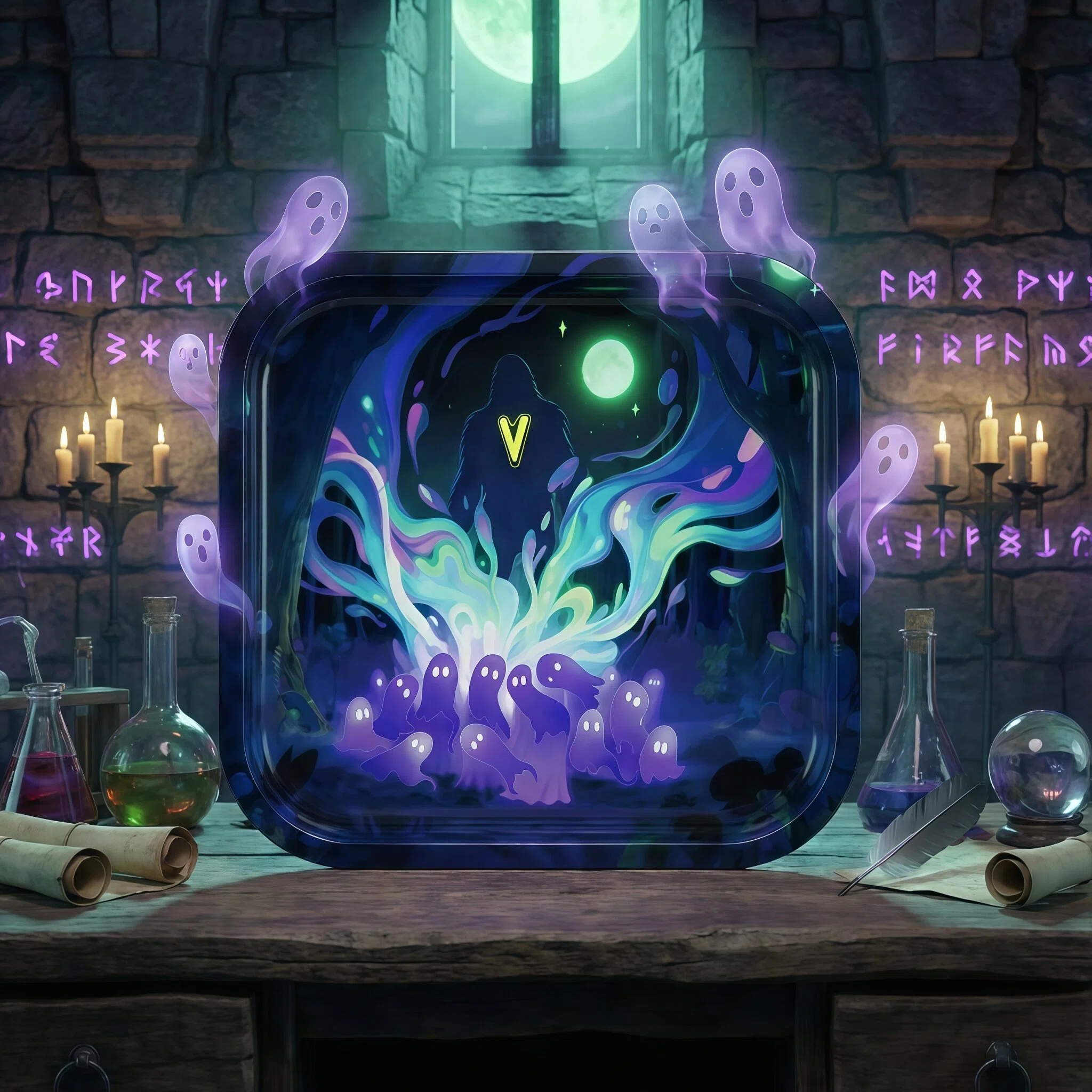 - Built to Last Forever Food-grade tinplate, scratch-resistant gloss finish, permanent full-color psychedelic “Spirit Realm” artwork (glowing purple spirits, cloaked guardian, full moon) that never fades or peels.